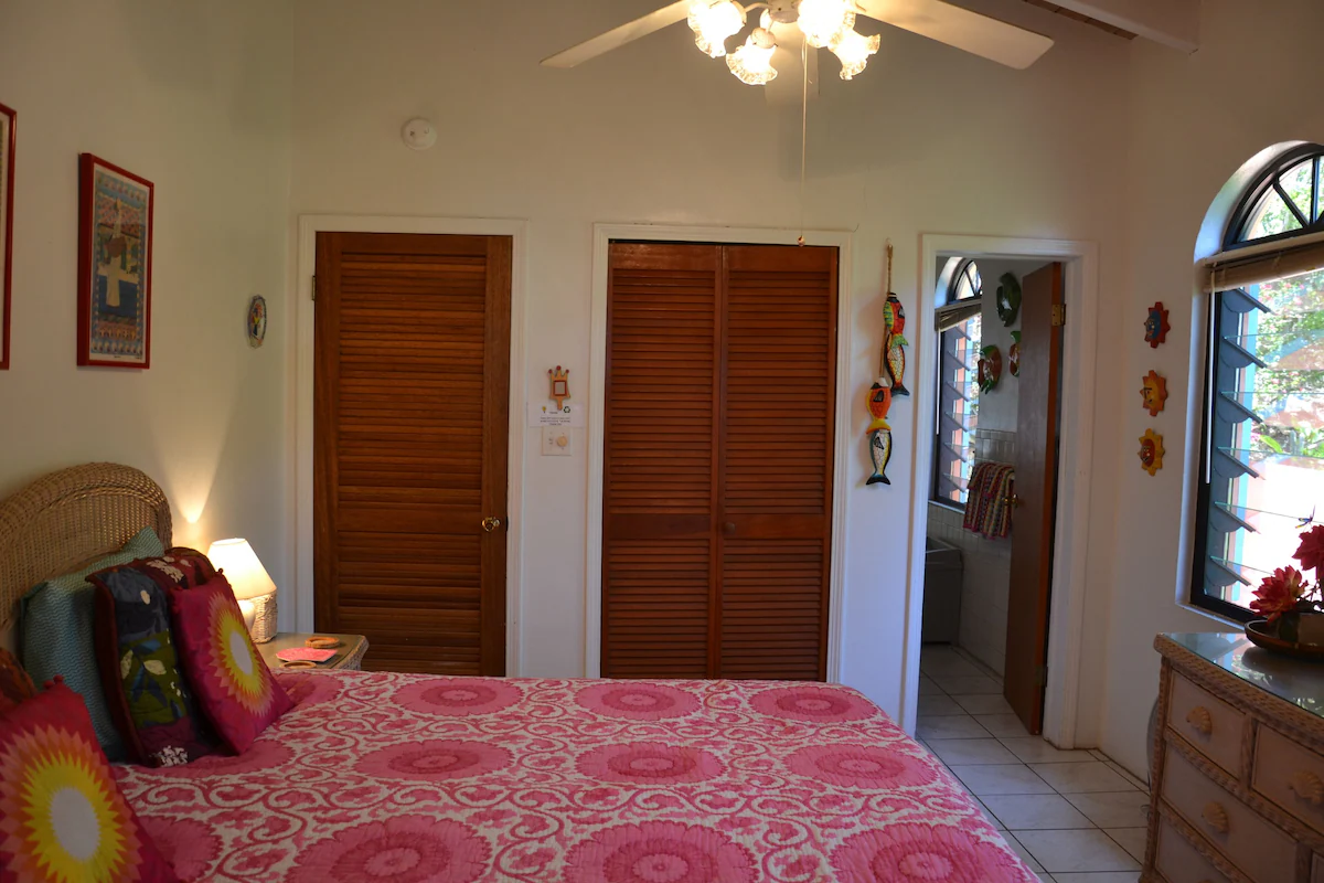 Queen bedroom with colorful decor.